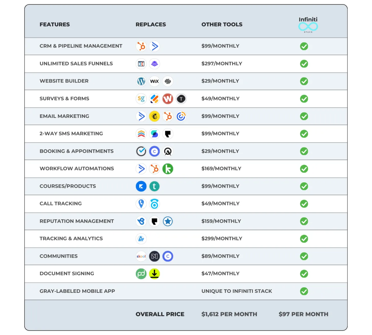 Yes, Infiniti Stack is designed to seamlessly integrate with a variety of tools and systems you may already be using but you may find you'll be able to cancel many of your subscriptions once you're fully integrated into Infiniti Stack.